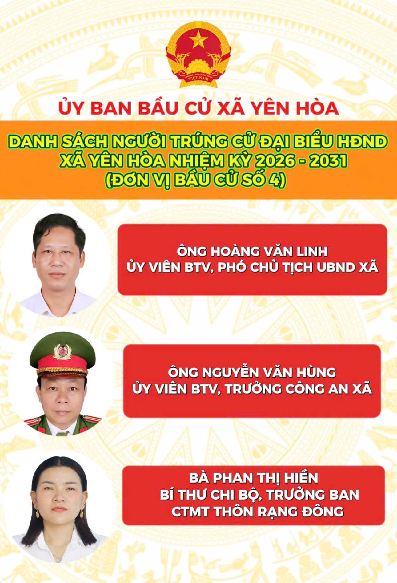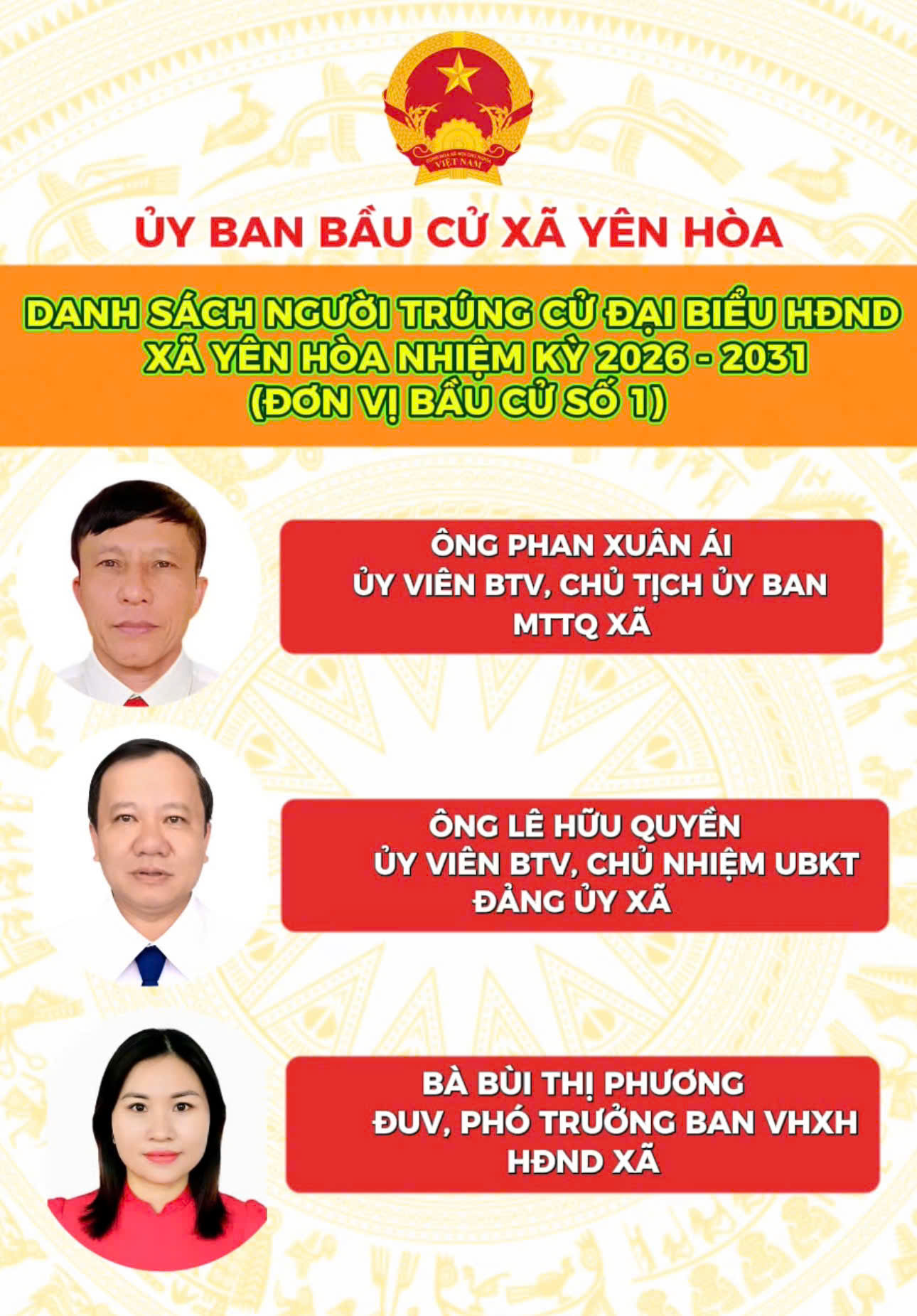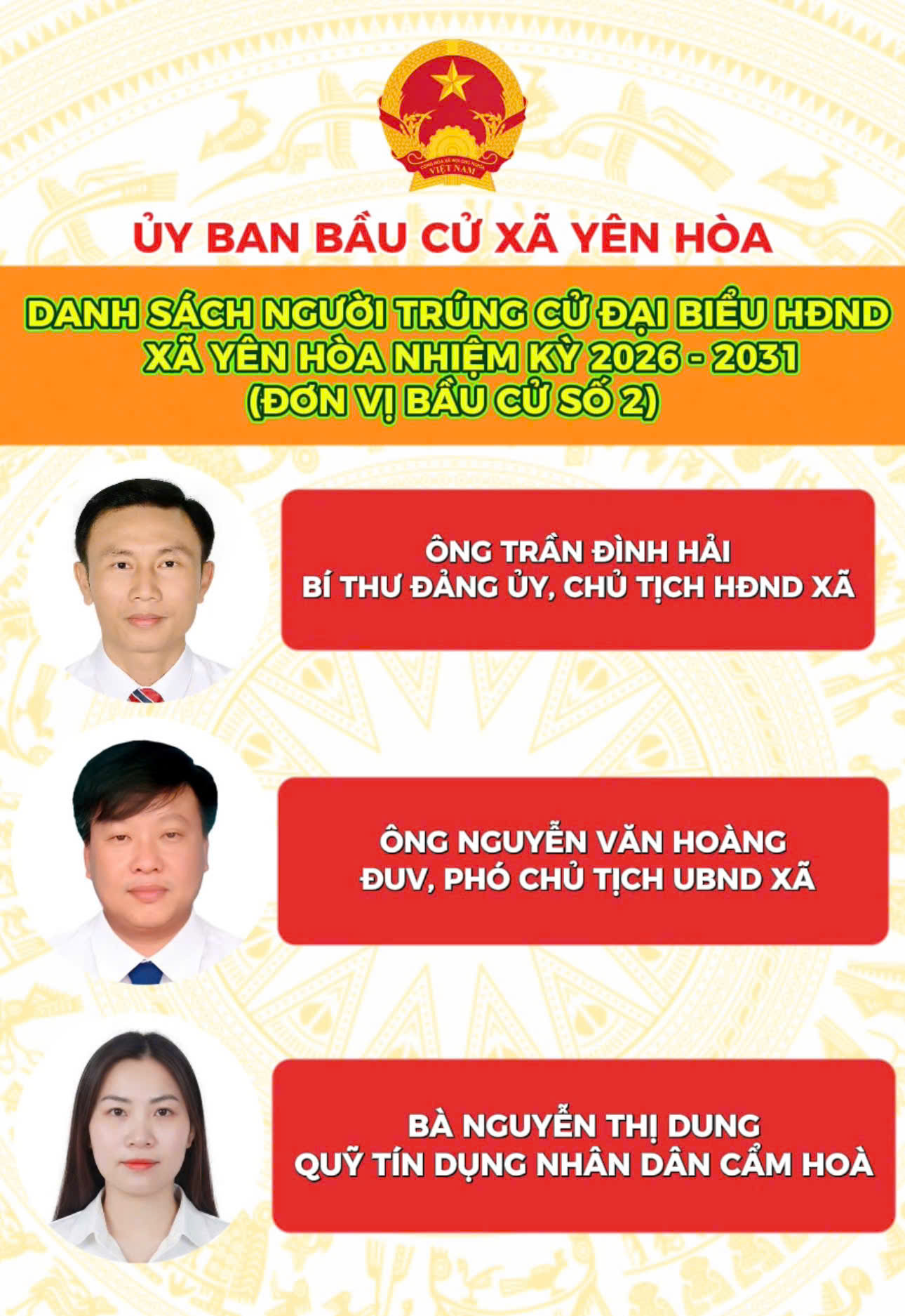 Danh sách người trúng cử Đại biểu HĐND xã Yên Hòa nhiệm kỳ 2026 - 2031Lan Ánh23/03/2026A -A+Lan Ánh23/03/2026A -A+DANH SÁCH 18 NGƯỜI TRÚNG CỬ ĐẠI BIỂU HĐND XÃ YÊN HÒA, NHIỆM KỲ 2026 - 2031