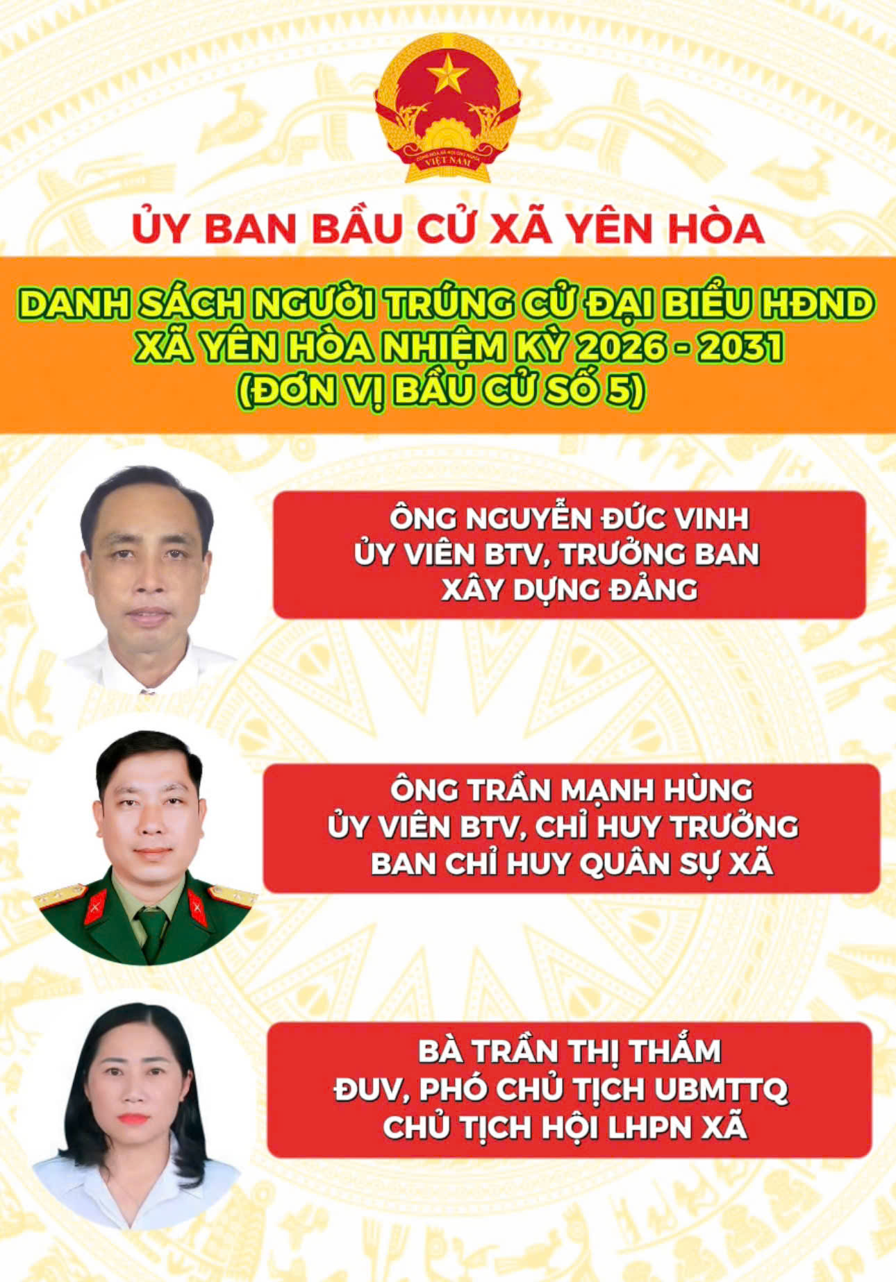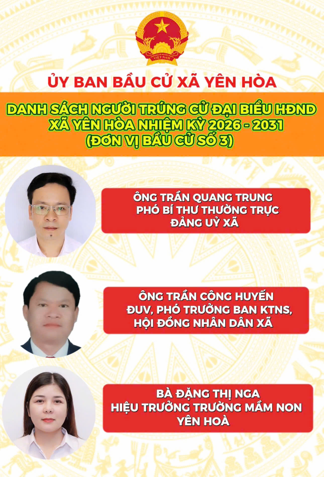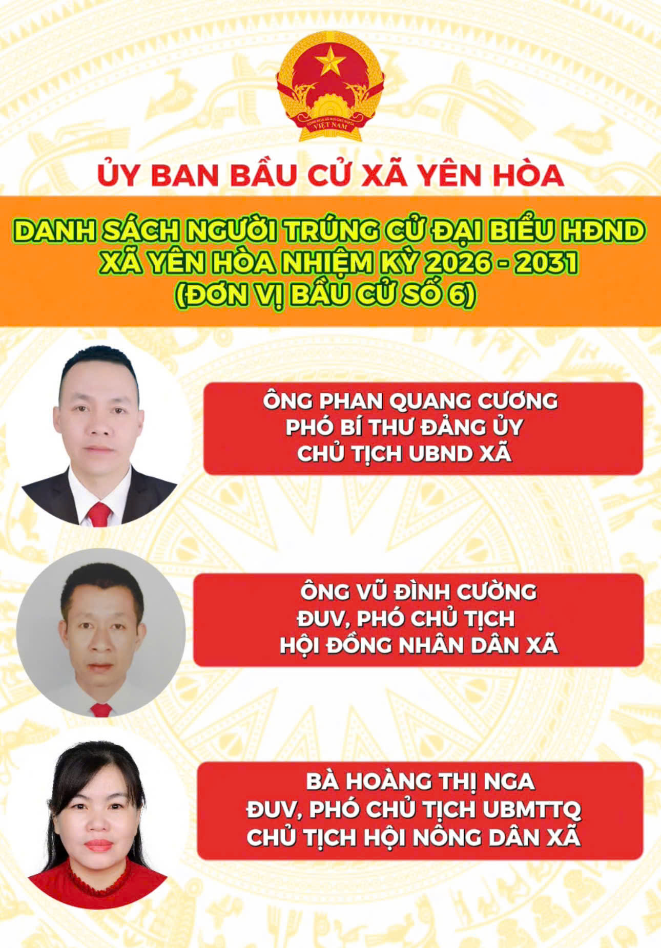 Danh sách người trúng cử Đại biểu HĐND xã Yên Hòa nhiệm kỳ 2026 - 2031Lan Ánh23/03/2026A -A+Lan Ánh23/03/2026A -A+DANH SÁCH 18 NGƯỜI TRÚNG CỬ ĐẠI BIỂU HĐND XÃ YÊN HÒA, NHIỆM KỲ 2026 - 2031