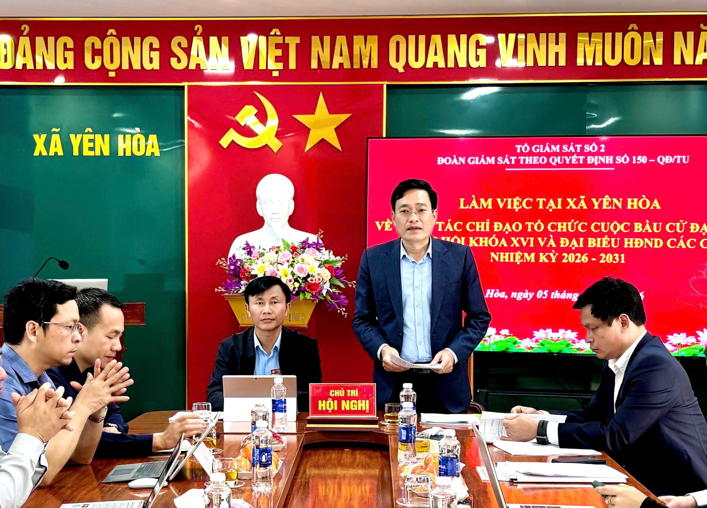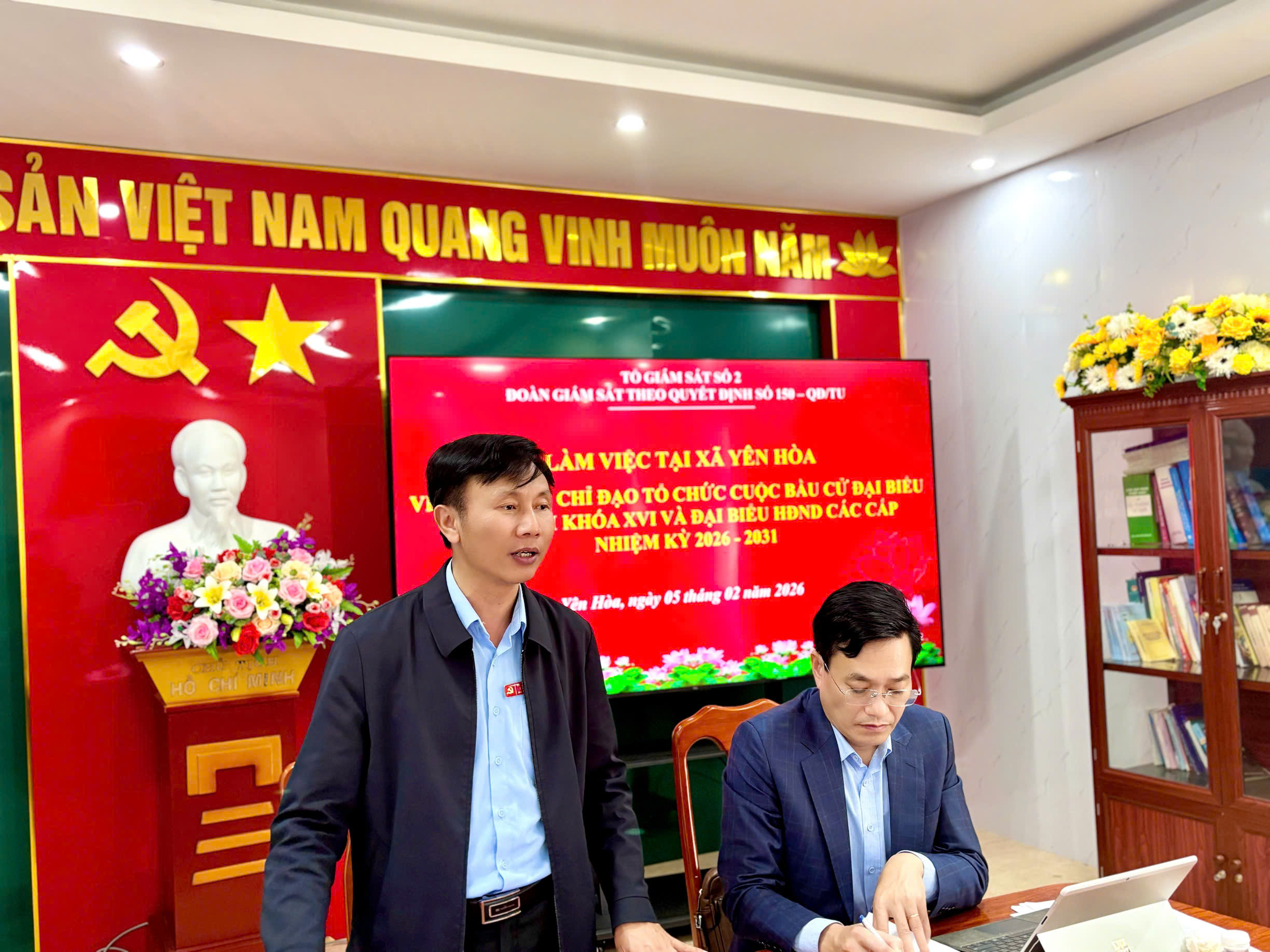 Chiều ngày 5/2/2026, Tổ giám sát số 2 thuộc Đoàn giám sát của BTV Tỉnh ủy Hà Tĩnh do đồng chí Phan Ngọc Long - Phó Chủ nhiệm Ủy ban Kiểm tra Tỉnh ủy làm Trưởng đoàn đã làm việc với xã Yên Hòa về việc công tác chỉ đạo tổ chức cuộc bầu cử Đại biểu Quốc hội khóa XVI và HĐND các cấp nhiệm kỳ 2026 - 2031. Đi cùng đoàn có các đồng chí đại diện Ban Tổ chức Tỉnh ủy, Ban Pháp chế HĐND tỉnh; Công an tỉnh. Phía xã có đồng chí Trần Đình Hải - Bí thư Đảng ủy, Chủ tịch HĐND xã; các đồng chí trong Thường trực Đảng ủy, Ủy viên BTV Đảng ủy, các phòng, ngành chuyên môn liên quan.