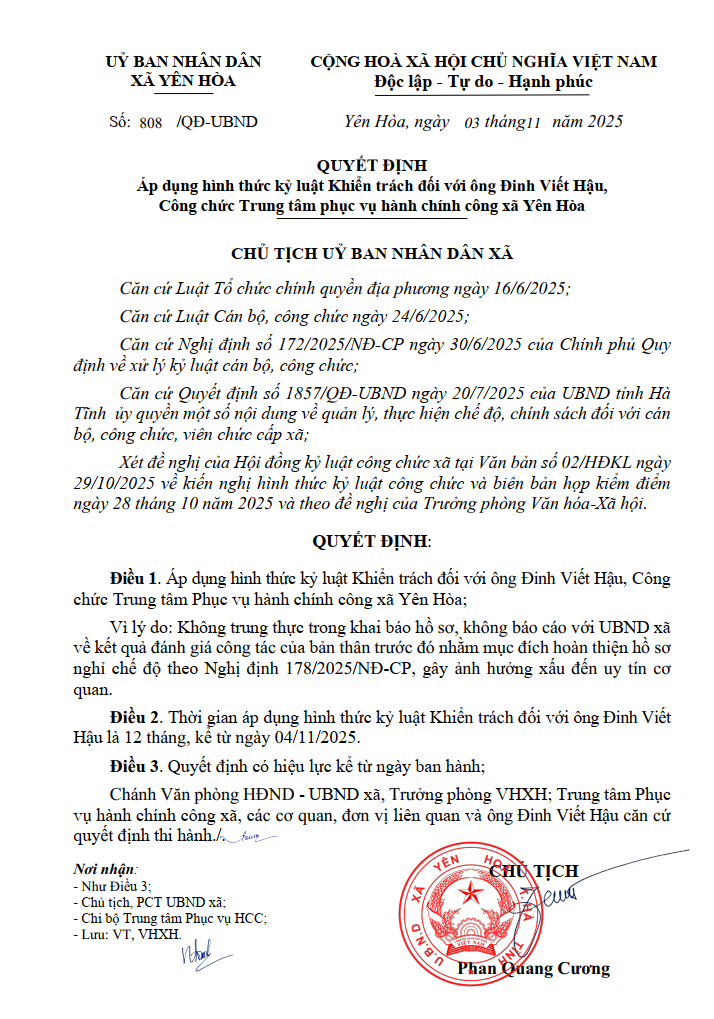 Quyết định áp dụng hình thức kỷ luật đối với công chức Đinh Viết Hậu Ẩn danh03/11/2025A -A+Ẩn danh03/11/2025A -A+