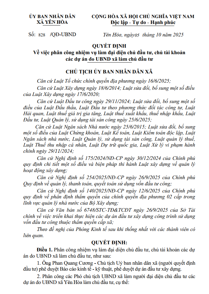 Quyết định phân công đại diện chủ đầu tư, chủ tài khoản các dự án do UBND xã làm chủ đầu tưẨn danh05/11/2025A -A+Ẩn danh05/11/2025A -A+