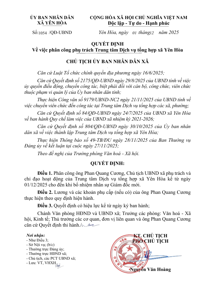 Quyết định phân công lãnh đạo phụ trách Trung tâm dịch vụ Tổng hợp xã Yên Hòa Văn phòng HDND-UBND01/12/2025A -A+Văn phòng HDND-UBND01/12/2025A -A+