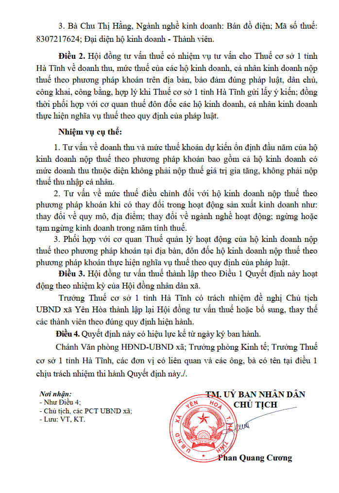 Quyết định thành lập hội đồng tư vấn thuế xã Yên HòaPhòng Kinh tế26/07/2025A -A+Phòng Kinh tế26/07/2025A -A+
