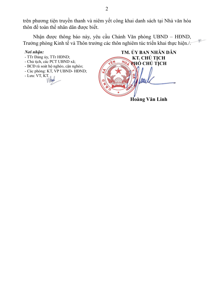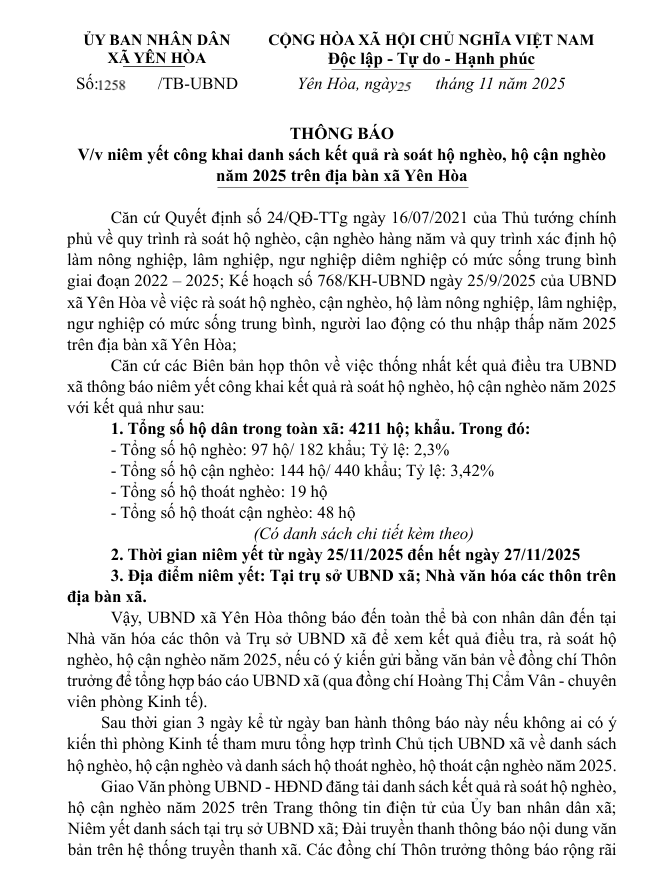 Thông báo niêm yết công khai danh sách kết quả rà soát hộ nghèo, hộ cận nghèo năm 2025 trên địa bàn xã Yên HòaPhòng Kinh tế25/11/2025A -A+Phòng Kinh tế25/11/2025A -A+ File đính kèm1. DS hộ nghèo.pdf2. DS hộ cận nghèo.pdf3. DS hộ thoát nghèo.pdf4. DS hộ thoát cận nghèo.pdfTB 1258 ubx niêm yết công khai danh sách kết quả rà soát hộ nghèo, hộ cận nghèo năm 2025 trên địa bàn xã Yên Hòa.pdf