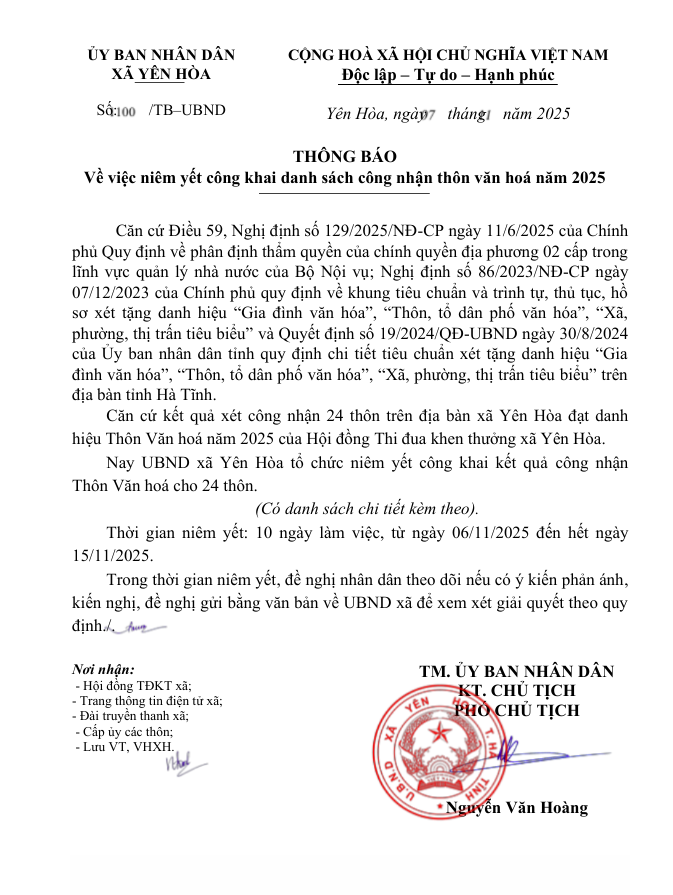 Tin liên quanXã Yên Hòa tổ chức hội nghị đối thoại với cán bộ, hội viên Hội Nông dân và Hội Liên hiệp Phụ nữ xãXã Yên Hòa tập huấn nâng cao nhận thức, kỹ năng chuyển đổi số cho người dânXã Yên Hòa tổ chức học tập, quán triệt triển khai Nghị quyết Đại hội Đại biểu Phụ nữ Hà Tĩnh lần thứ XVII, nhiệm kỳ 2025 - 2030Thông báo Niêm yết công khai Báo cáo đánh giá tác động môi trường của Dự án: Nhà máy điện gió Eco Wind Kỳ AnhThông báo Lịch tiếp công dân định kỳ của Chủ tịch UBND xã tháng 12/2025
