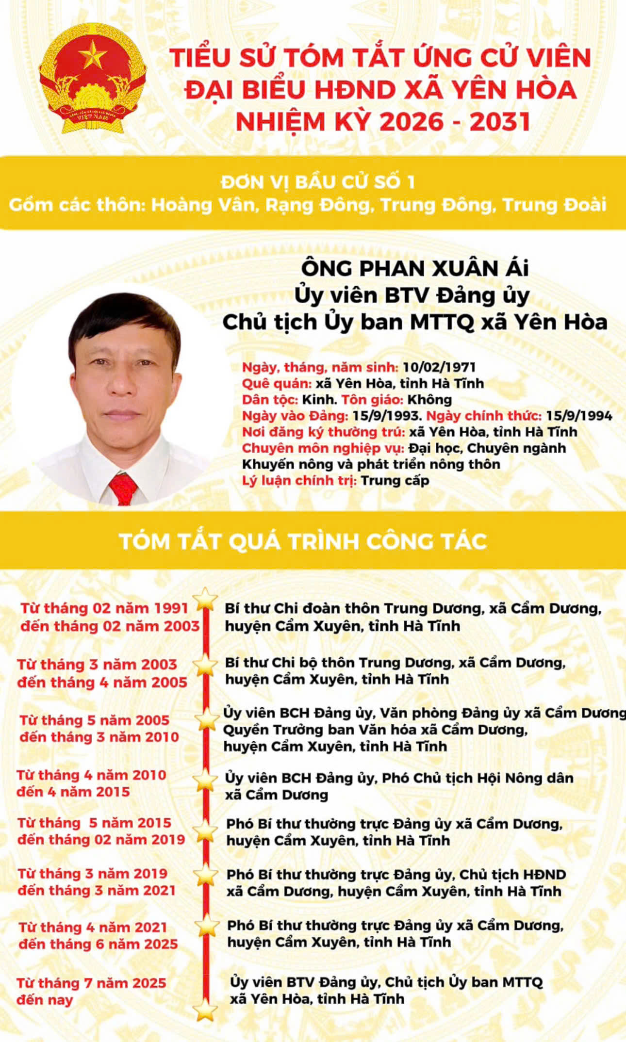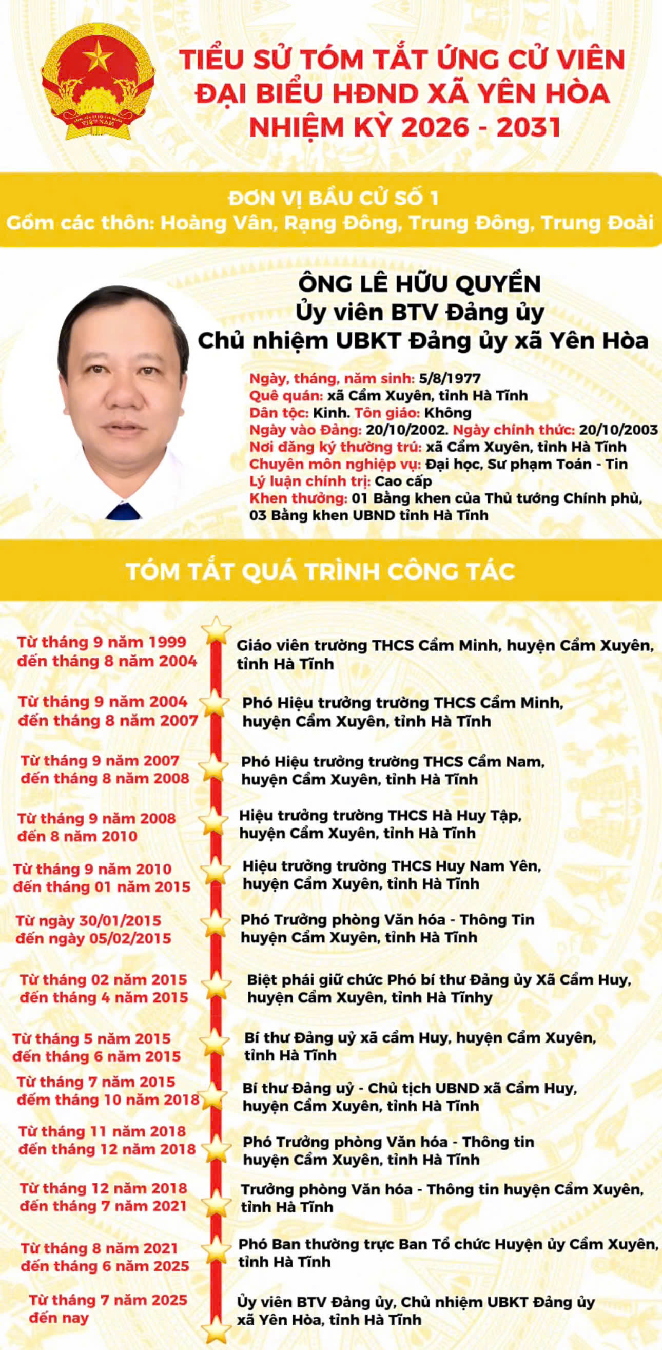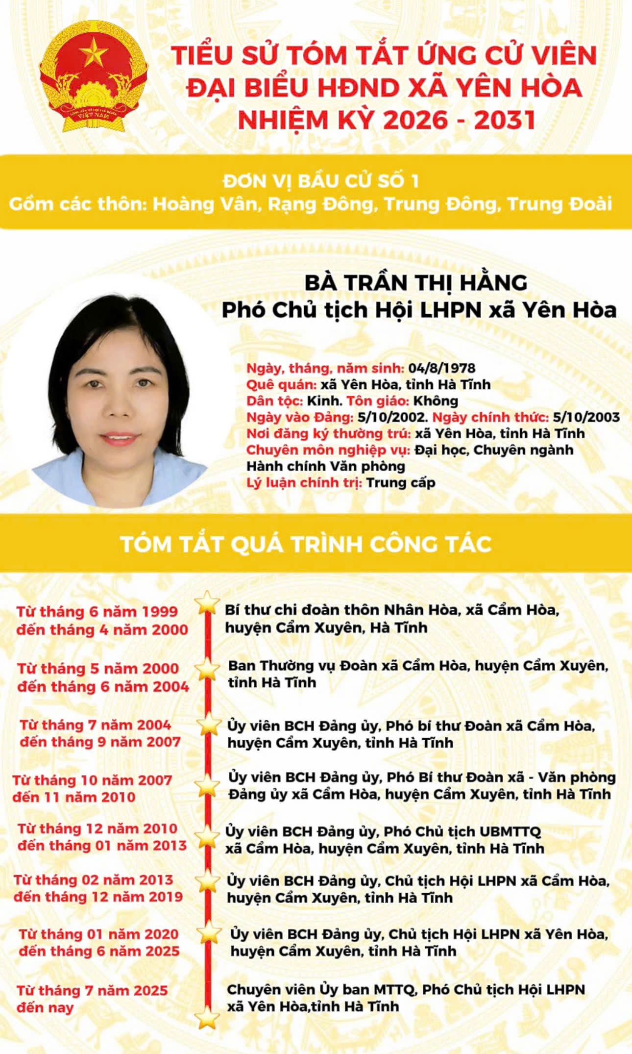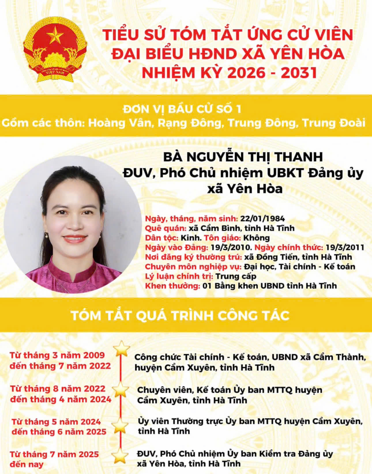 TIỂU SỬ ỨNG CỬ VIÊN ĐẠI BIỂU HĐND XÃ YÊN HÒA NHIỆM KỲ 2026 - 2031 TẠI ĐƠN VỊ BẦU CỬ SỐ 1