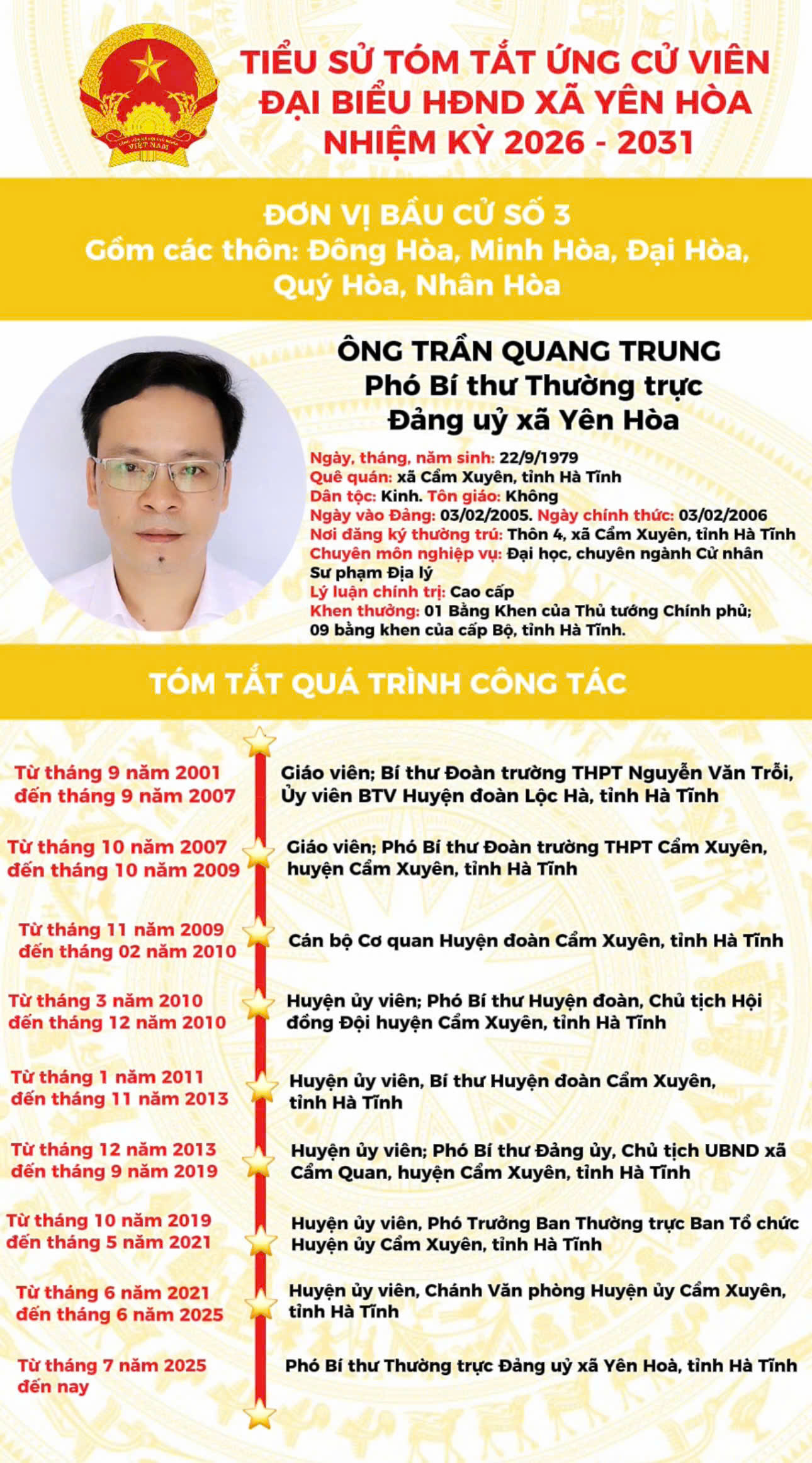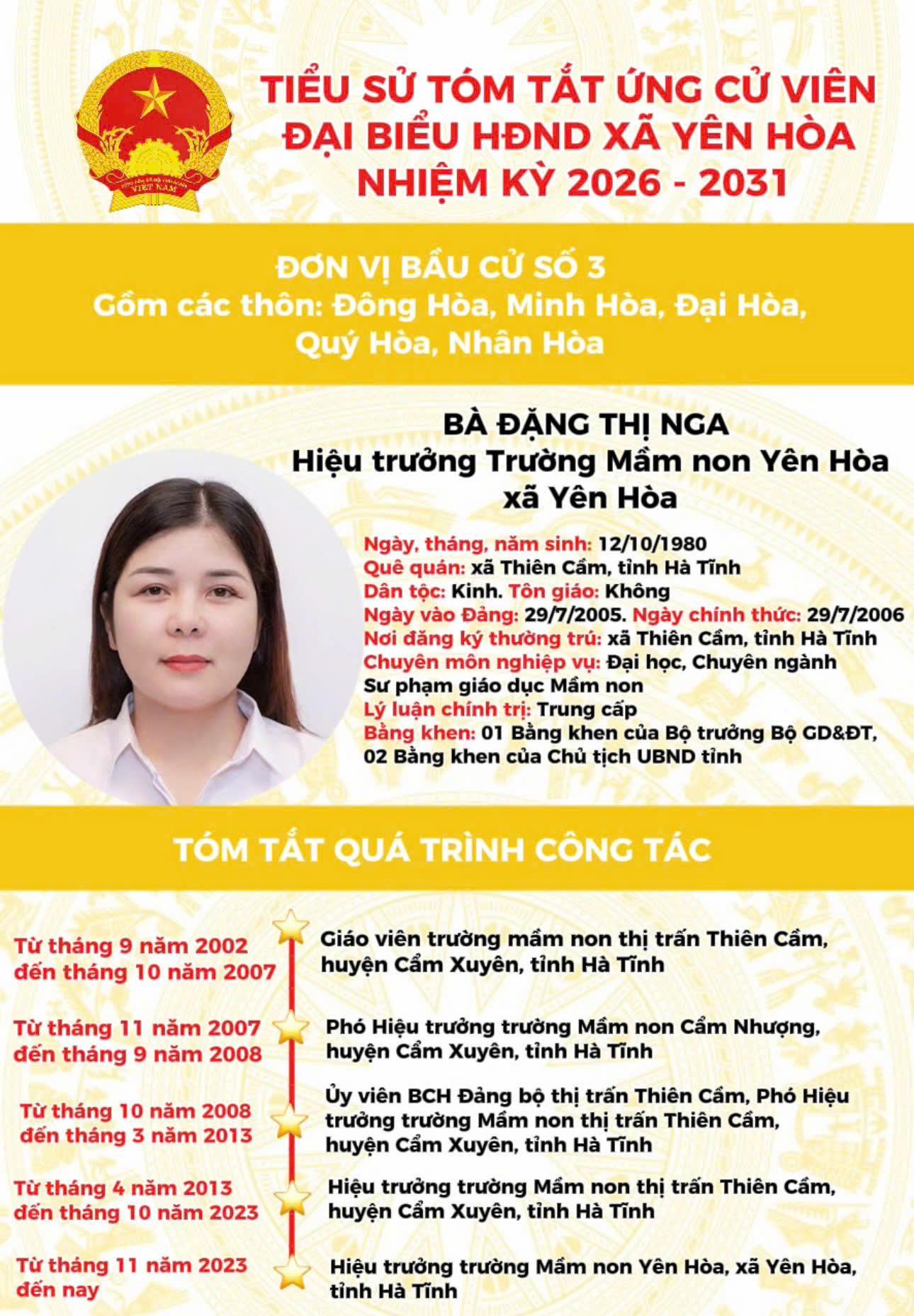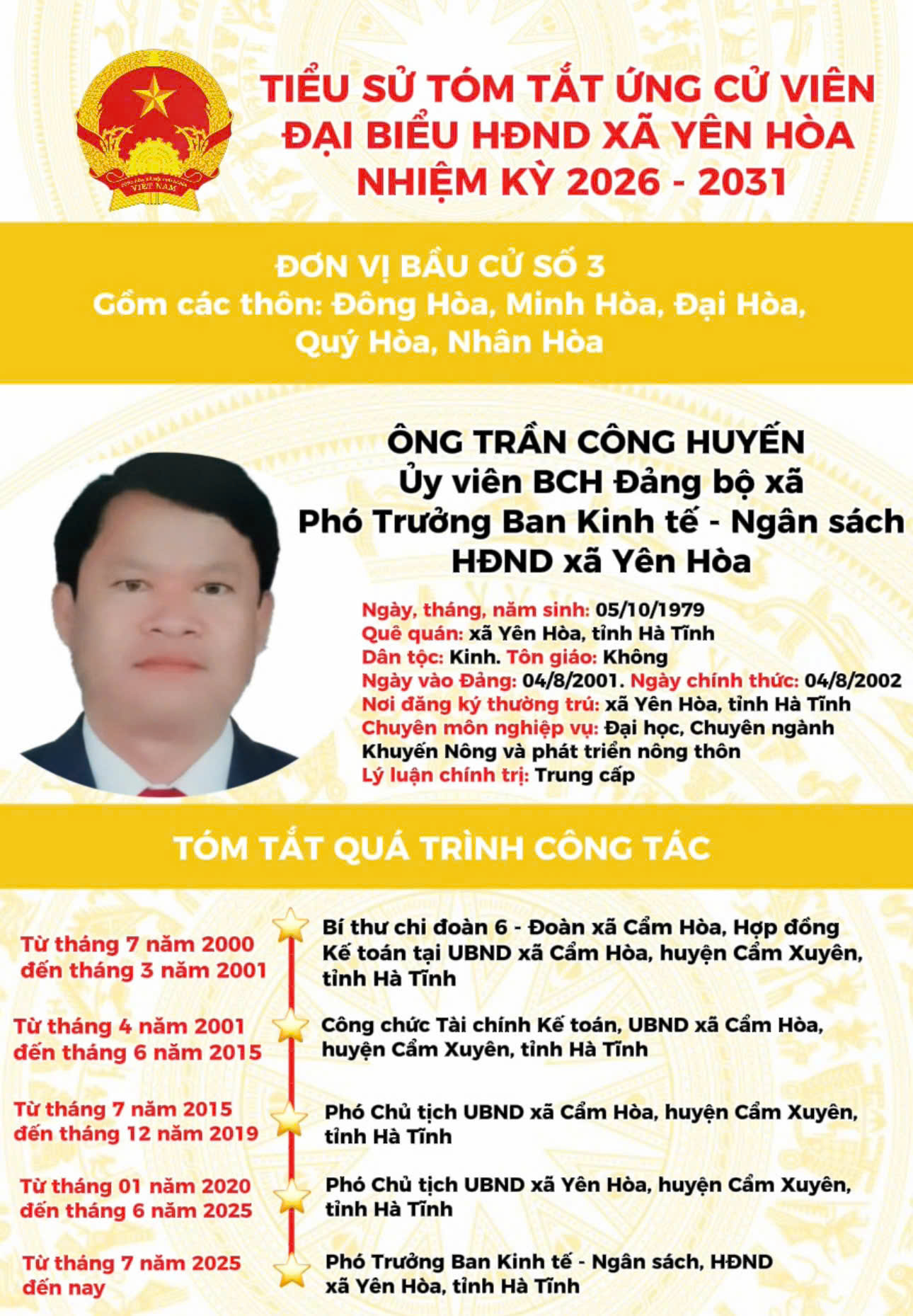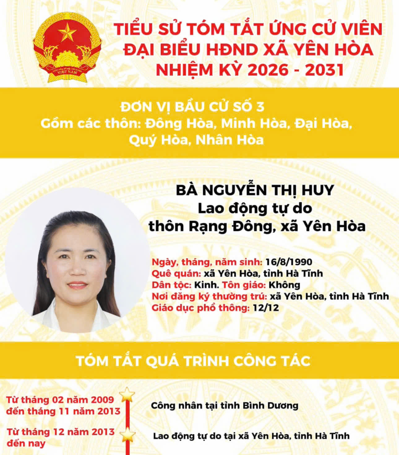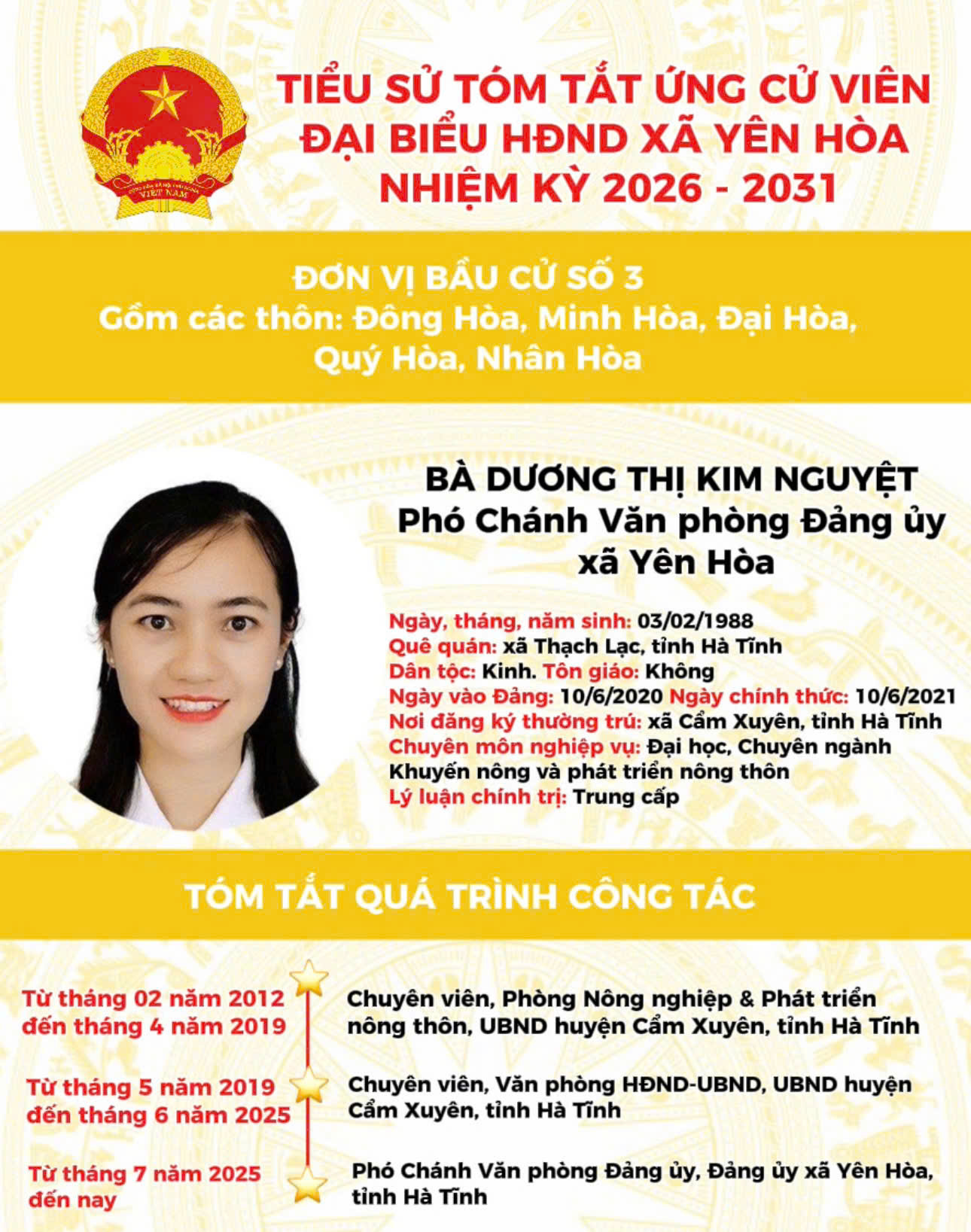 TIỂU SỬ ỨNG CỬ VIÊN ĐẠI BIỂU HĐND XÃ YÊN HÒA NHIỆM KỲ 2026 - 2031 TẠI ĐƠN VỊ BẦU CỬ SỐ 3