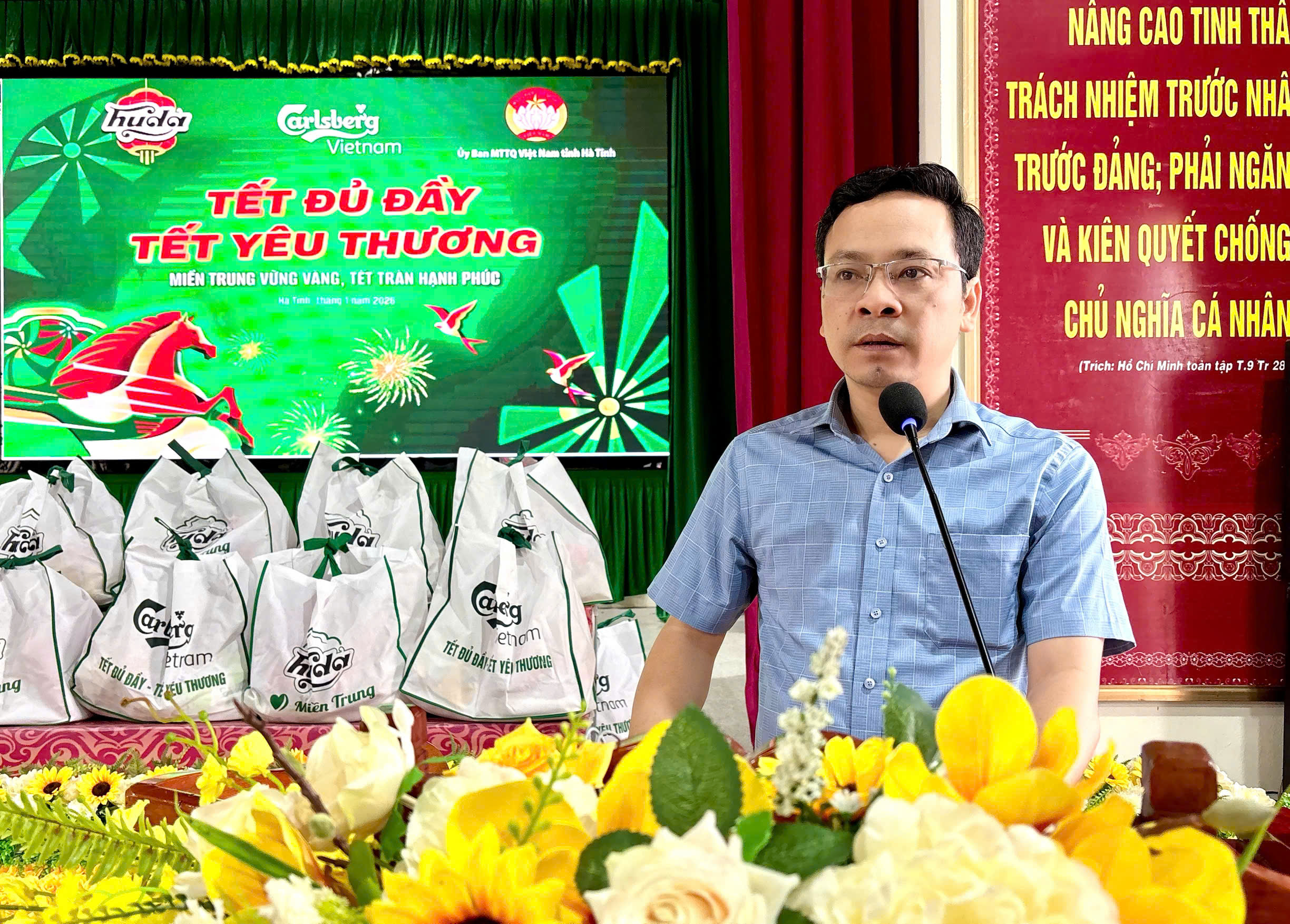 Phát biểu tại buổi trao quà, đồng chí Trần Quang Trung – Phó Bí thư Thường trực Đảng ủy xã bày tỏ sự trân trọng và cảm ơn sâu sắc tới Tổng Công ty Bia Carlsberg – Huda đã quan tâm, đồng hành cùng địa phương trong công tác an sinh xã hội. Đồng chí nhấn mạnh, đây là hoạt động ý nghĩa, thể hiện tinh thần trách nhiệm xã hội của doanh nghiệp đối với cộng đồng, góp phần giúp các hộ gia đình vơi bớt khó khăn, có thêm động lực vươn lên trong cuộc sống. Đồng chí Phó Bí thư Thường trực Đảng ủy xã mong muốn trong thời gian tới tiếp tục nhận được sự quan tâm, phối hợp, hỗ trợ của các cơ quan, đơn vị, doanh nghiệp, tổ chức và các nhà hảo tâm để thực hiện tốt công tác an sinh xã hội trên địa bàn.