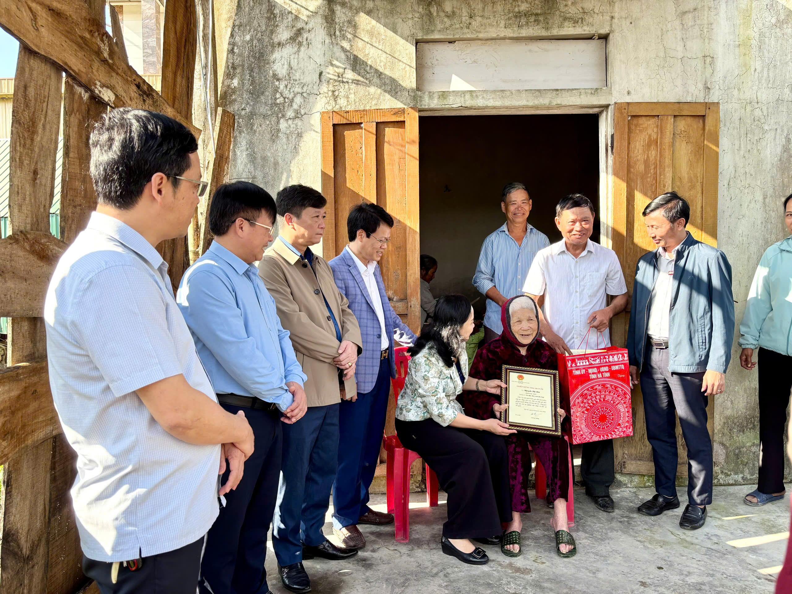 Đoàn đã đến mừng thọ, tặng quà cho bà Nguyễn Thị Bốn, sinh năm 1926, trú tại thôn Bình Thọ, xã Yên Hòa. Bà Bốn năm nay tròn 100 tuổi. Tại đây, các đồng chí trong Đoàn đã ân cần thăm hỏi sức khỏe, chúc bà sống vui, sống khỏe, tiếp tục là chỗ dựa tinh thần, tấm gương sáng cho con cháu noi theo, đồng thời trao quà và thiếp mừng thọ của Chủ tịch nước Lương Cường cùng phần quà của đoàn công tác tỉnh Hà Tĩnh. Qua đó thể hiện sự quan tâm, trách nhiệm của Đảng và Nhà nước đối với người cao tuổi trên địa bàn.