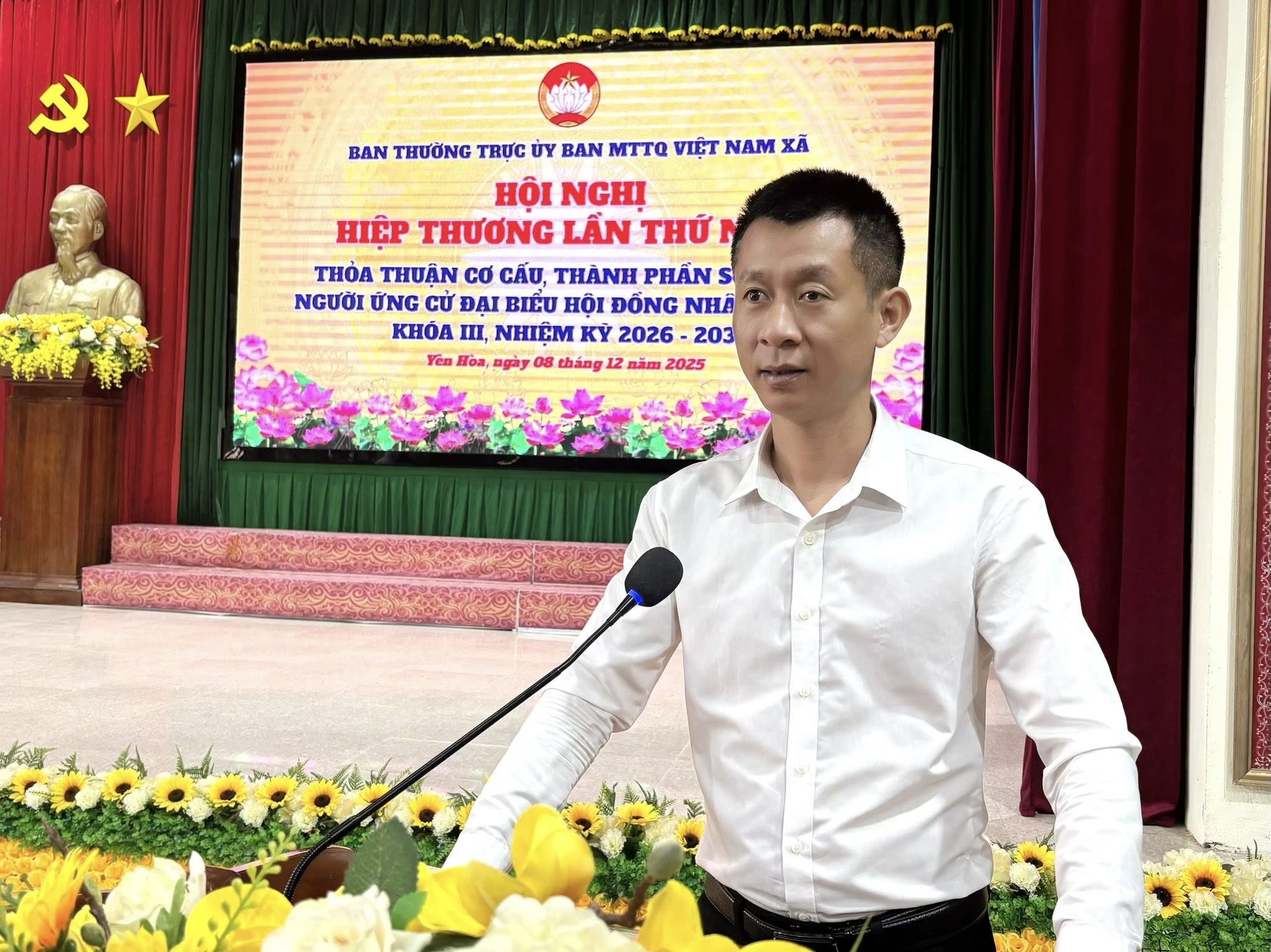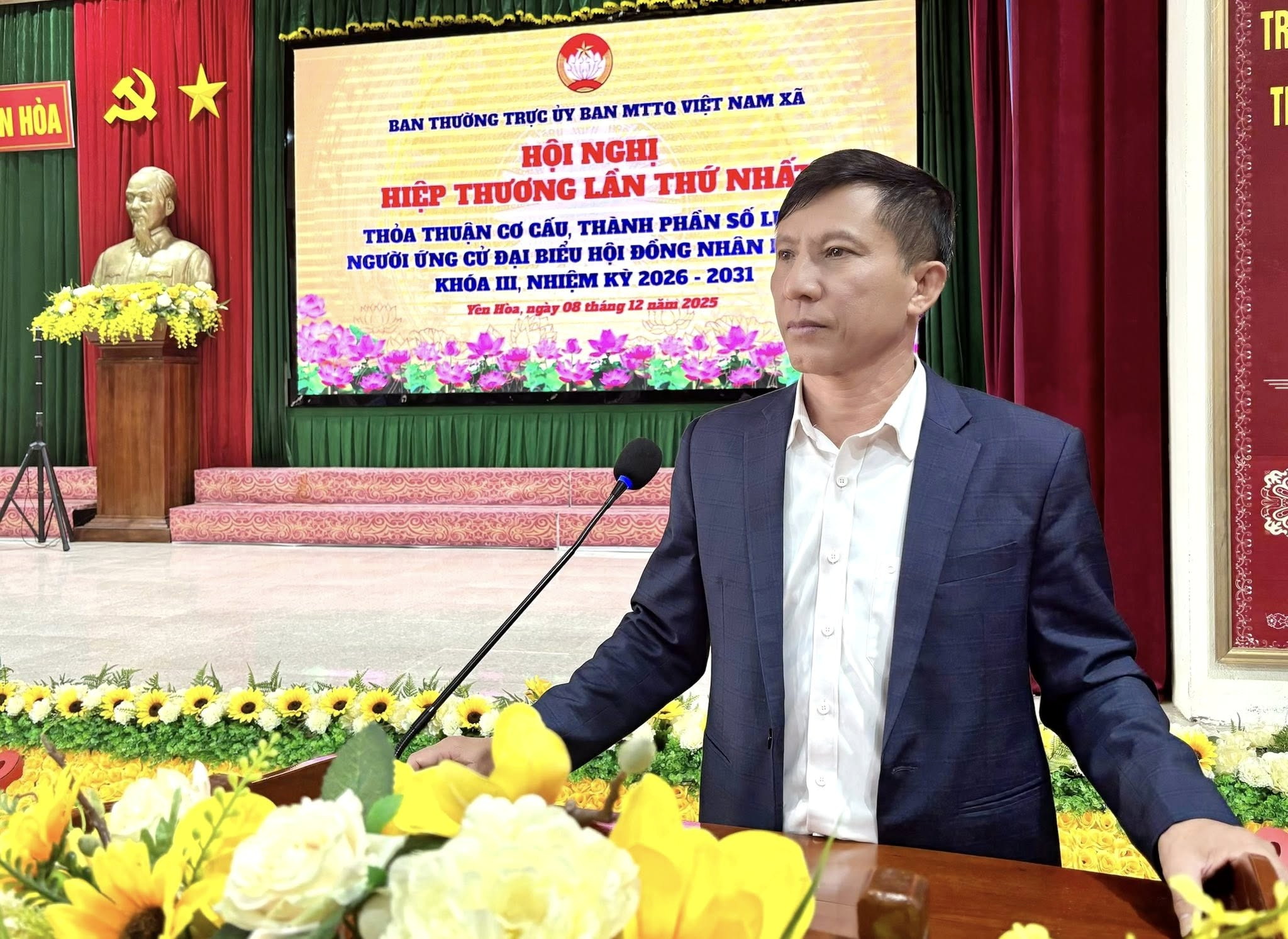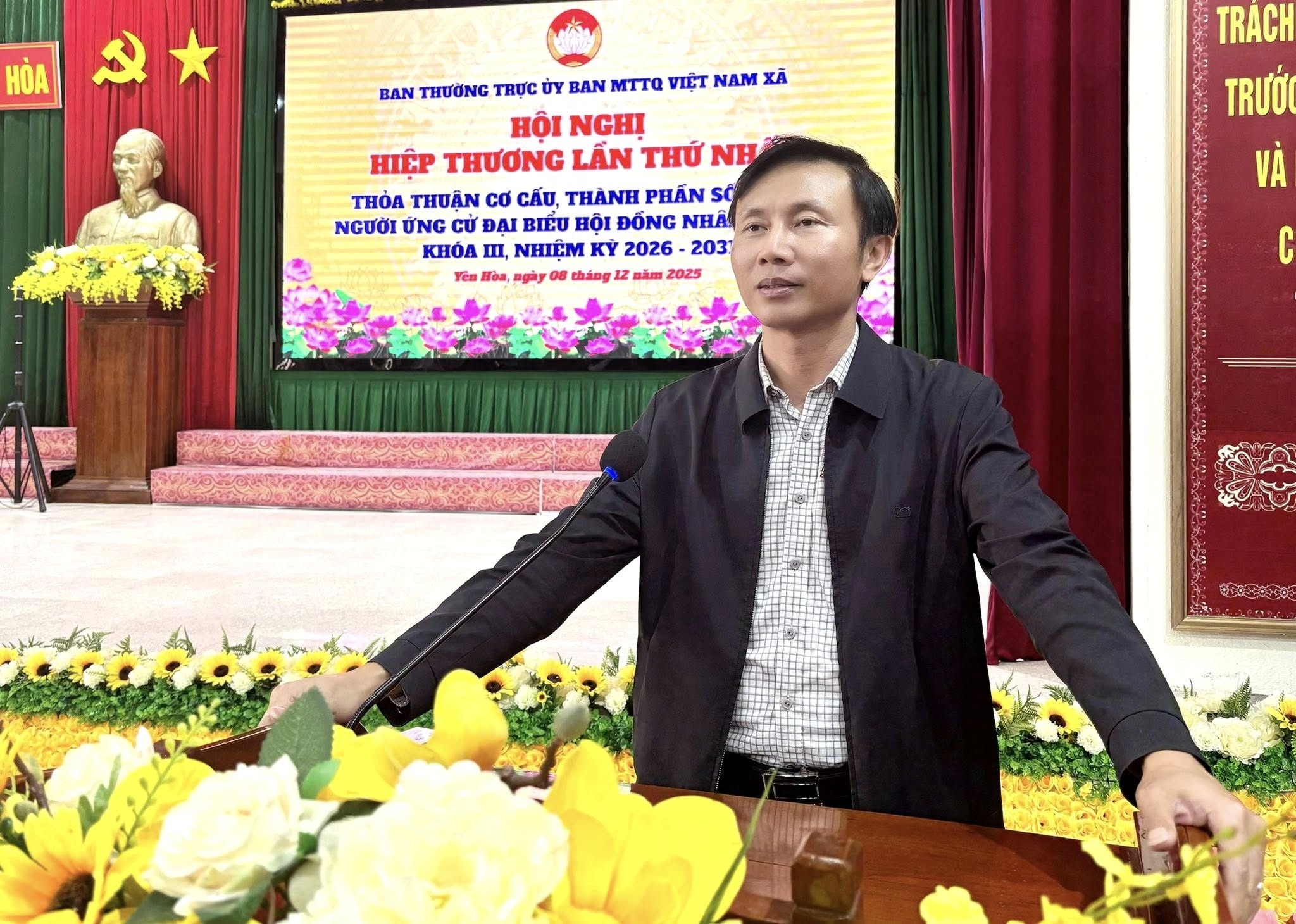 Sáng ngày 08/12/2025, Ủy ban Mặt trận Tổ quốc xã Yên Hòa tổ chức hội nghị hiệp thương lần thứ nhất thỏa thuận cơ cấu, thành phần số lượng người ứng cử đại biểu HĐND xã khóa III, nhiệm kỳ 2026 - 2031. Tham dự hội nghị có đồng chí Trần Đình Hải - Bí thư Đảng ủy, Chủ tịch HĐND xã; đồng chí Trần Quang Trung - Phó Bí thư Thường trực Đảng ủy; Đồng chí Phan Quang Cương - Phó Bí thư Đảng ủy, Chủ tịch UBND xã; các đồng chí Ủy viên BTV Đảng ủy, Thường trực HĐND, lãnh đạo UBND; Ủy ban MTTQ và các tổ chức đoàn thể cùng dự.