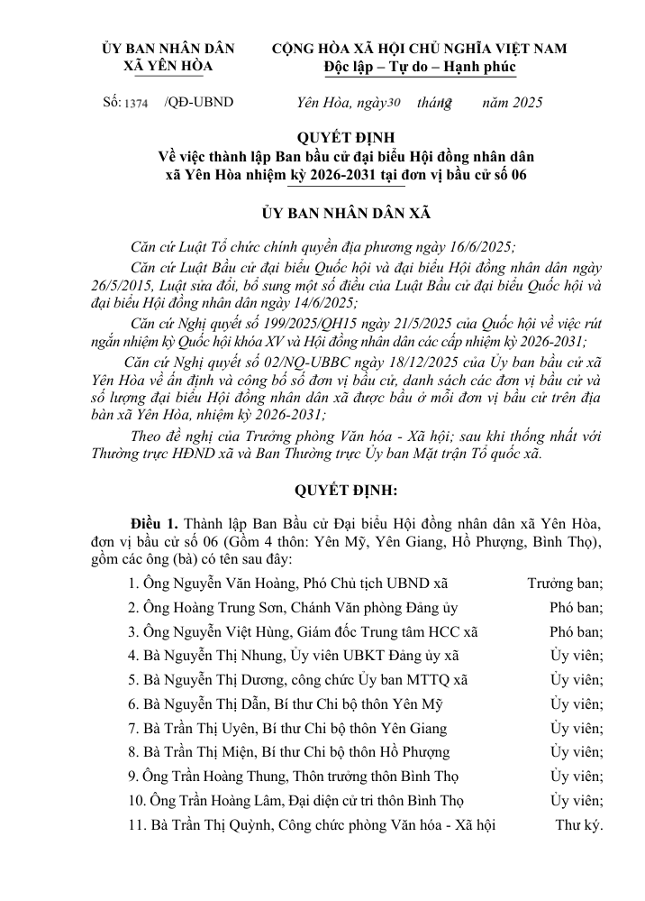 Về việc thành lập Ban bầu cử đại biểu Hội đồng nhân dân xã Yên Hòa nhiệm kỳ 2026-2031 tại đơn vị bầu cử số 06Nguyễn Việt Hùng30/12/2025A -A+Nguyễn Việt Hùng30/12/2025A -A+