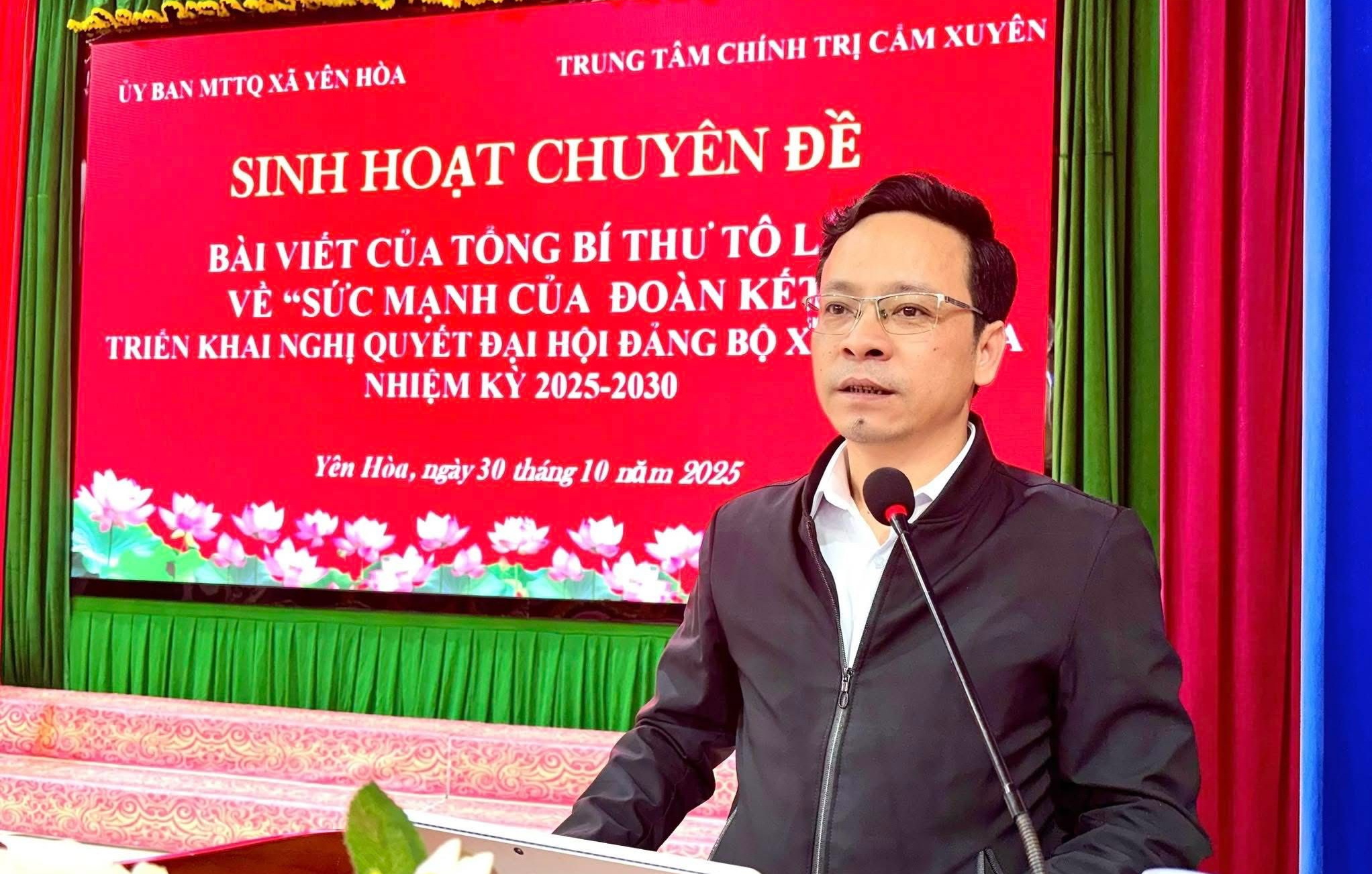 Chiều ngày 30/10, Ủy ban MTTQ xã Yên Hòa tổ chức buổi sinh hoạt chuyên đề bài viết của Tổng Bí thư Tô Lâm “Sức mạnh của sự đoàn kết” và triển khai Nghị quyết Đại hội Đảng bộ xã nhiệm kỳ 2025–2030.