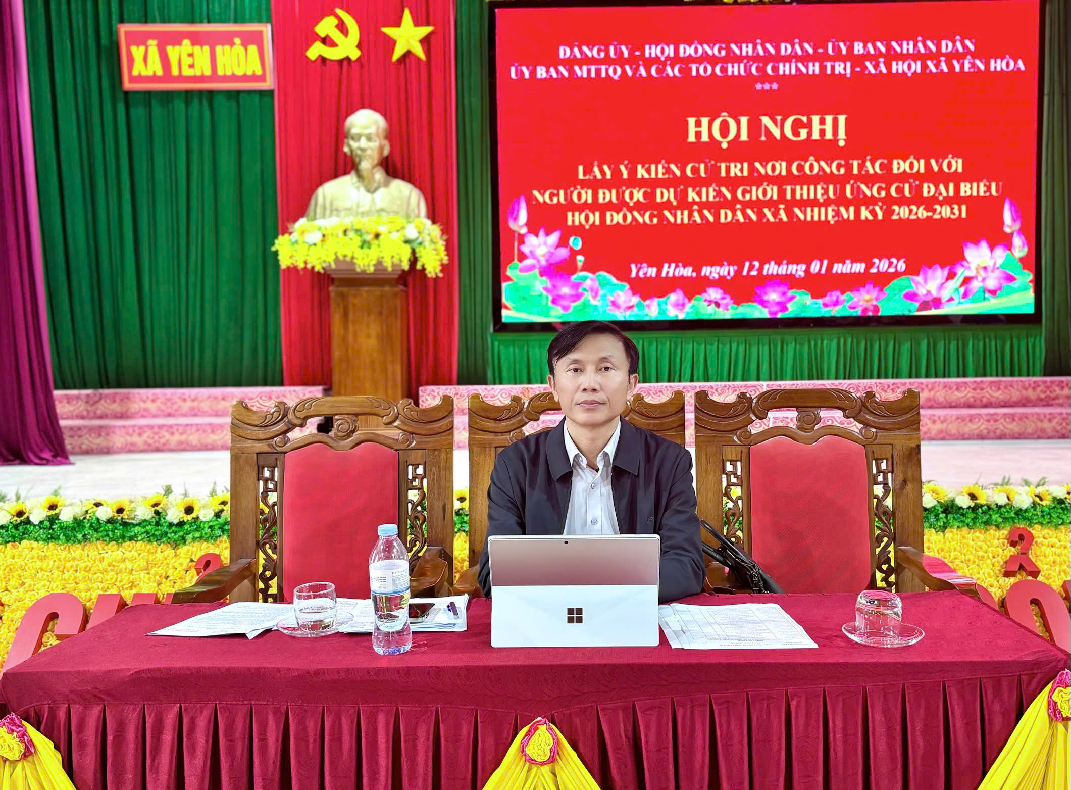 Thực hiện quy trình hiệp thương theo quy định của pháp luật về bầu cử Đại biểu Quốc hội và HĐND các cấp nhiệm kỳ 2026 - 2031, chiều ngày 12/1/2026, Đảng uỷ, HĐND, UBND, Uỷ ban MTTQ và các tổ chức chính trị - xã hội xã Yên Hoà, tỉnh Hà Tĩnh tổ chức hội nghị lấy ý kiến cử tri nơi công tác đối với người được dự kiến giới thiệu ứng cử đại biểu HĐND xã, nhiệm kỳ 2026–2031. Tham dự hội nghị có các đồng chí Thường trực Đảng uỷ; Thường trực HĐND; Lãnh đạo UBND, Uỷ ban MTTQ và cán bộ, công chức, viên chức, người lao động cùng dự.