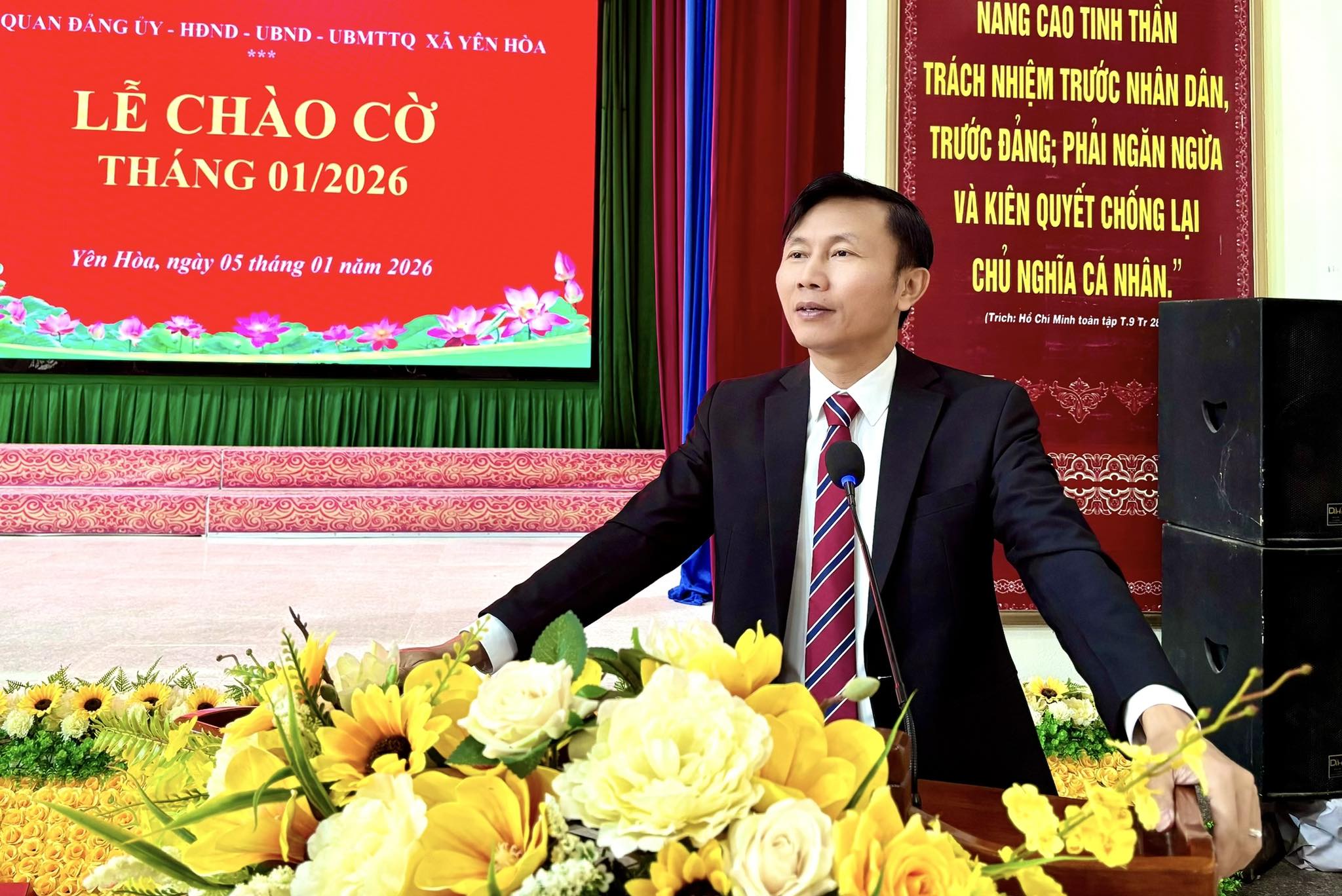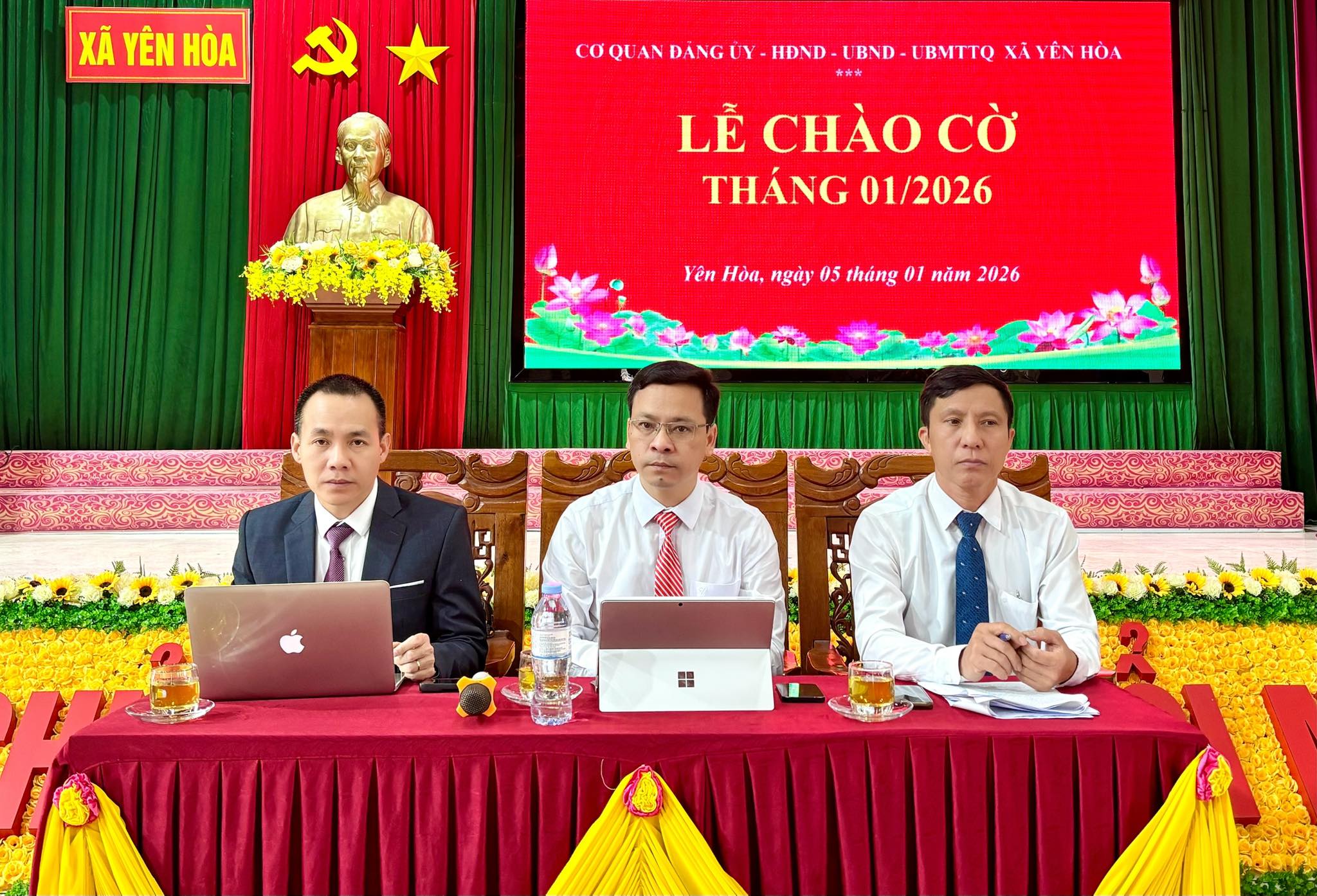Sáng ngày 05/01/2026, Đảng ủy - HĐND - UBND - Ủy ban MTTQ xã Yên Hòa, tỉnh Hà Tĩnh tổ chức Lễ chào cờ tháng 01/2026 và công bố quyết định thành lập, tiếp nhận, bố trí viên chức về công tác tại Trạm Y tế xã. Tham dự có đồng chí Trần Đình Hải - Bí thư Đảng ủy, Chủ tịch HĐND xã; đồng chí Trần Quang Trung - Phó Bí thư Thường trực Đảng ủy; đồng chí Phan Quang Cương - Phó Bí thư Đảng ủy, Chủ tịch UBND xã; các đồng chí trong BTV Đảng ủy, BCH Đảng bộ xã; Thường trực HĐND, lãnh đạo UBND, Ủy ban MTTQ và các tổ chức đoàn thể; Trưởng, phó các phòng, ban, đơn vị trực thuộc và toàn thể cán bộ, công chức, viên chức xã cùng dự.